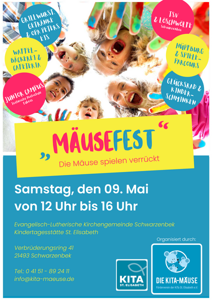 Die Kita-Mäuse – der Förderverein der KiTa St. Elisabeth e.V.- veranstalten am 9. Mai 2026 ab 12 Uhr ein Sommerfest mit Kinderschminken, Glücksrad, Hüpfburg & Spieleparcours. Zum Beginn des Sommerfestes wird ein Familiengottesdienst mit Pastorin Kühn stattfinden. Die Technische Hochschule Lübeck wird Experimente durchführen und auch der TSV und die Löschwöfe werden vor Ort sein. Für das leibliche Wohl ist gesorgt und so werden u.a. Grillwurst, Waffeln, Eis von Opa Peters und Getränke angeboten. Lasst Euch das nicht entgehen und schaut vorbei.