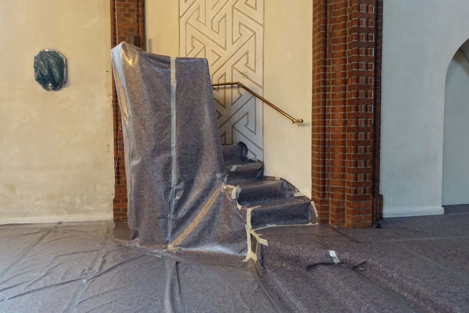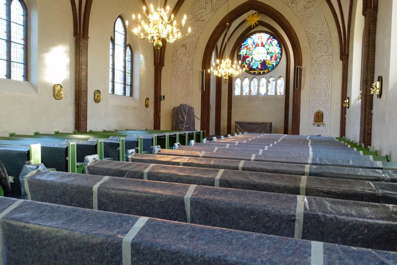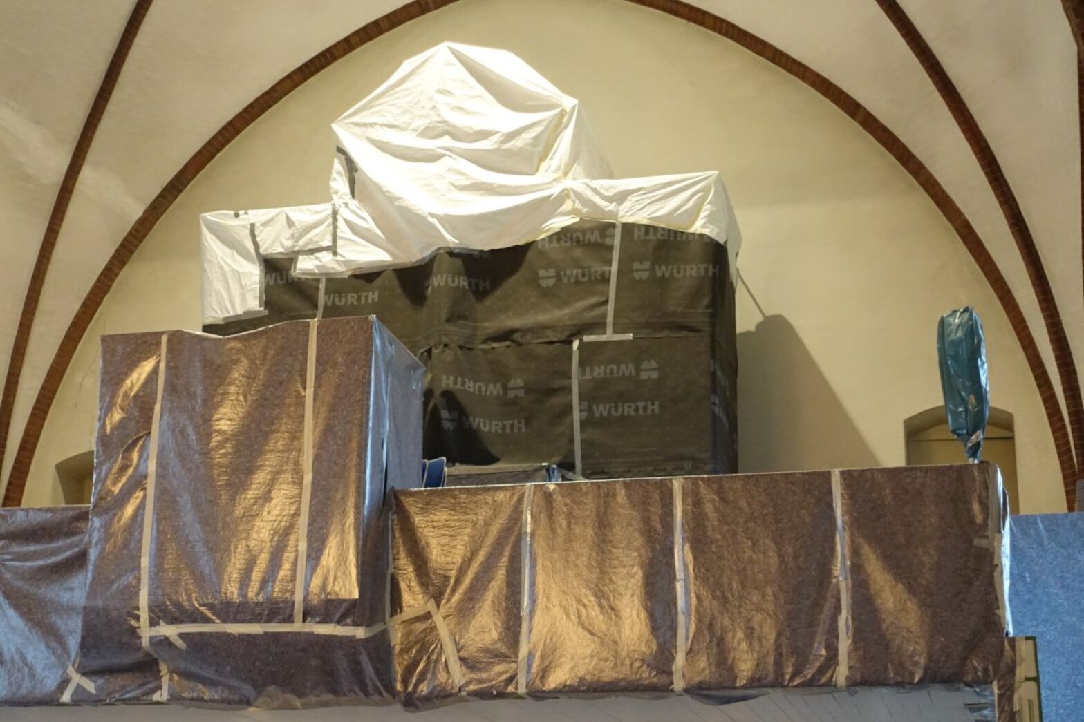 Seit dem Beginn der Arbeiten, die sich auf den Innenraum konzentrieren, schützt Malervlies die Einrichtung vor Staub und Schmutz. „Es sieht aus wie ein Werk des Verhüllungskünstlers Christo“, schmunzelt Schöer. Im nächsten Schritt wird ein Gerüst mit einer Plattform aufgebaut, das sich über das gesamte Kirchenschiff erstreckt. Zur Stabilisierung der Kirche werden dauerhaft drei Stahlrohre eingesetzt, die im Innenraum sichtbar bleiben.